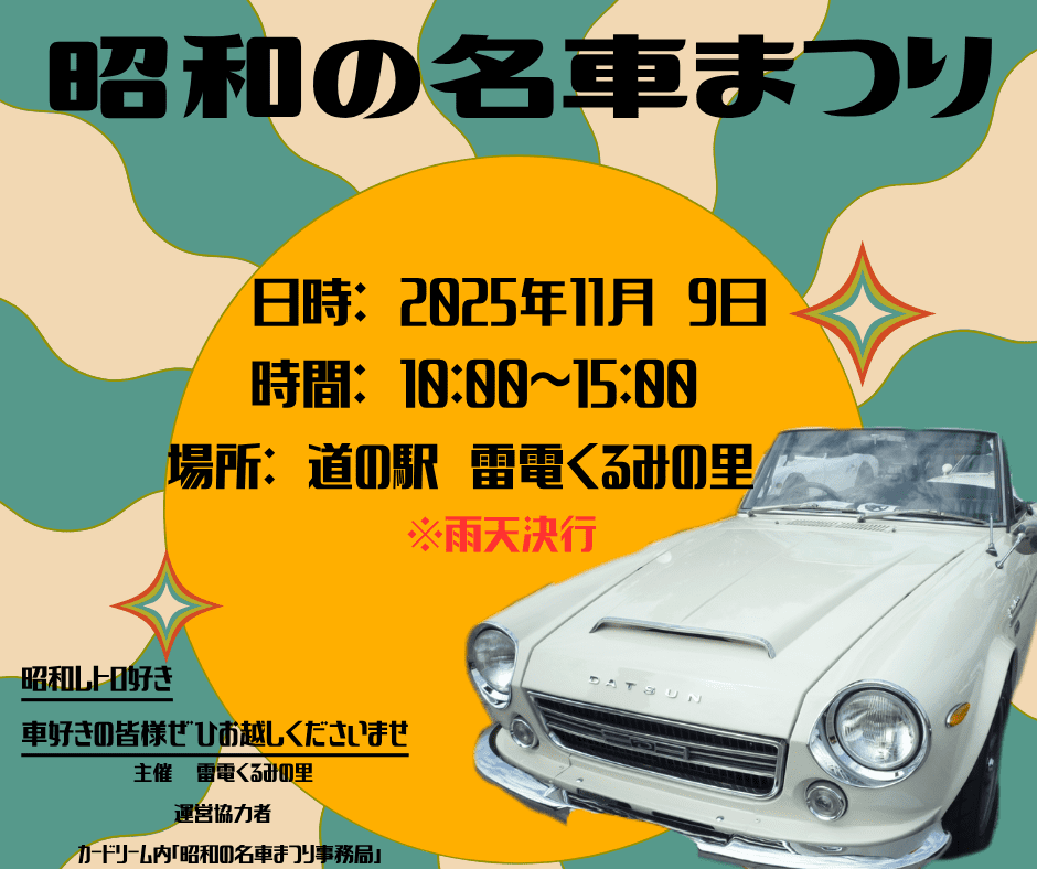 2025年イベント(終了) 一覧へ戻る★毎年恒例★昭和の名車まつり 2025 11月9日(日)開催! 今年の昭和の名車まつりの開催日開催日 :令和7年11月9日(日)開催場所:道の駅 雷電くるみの里開催時間:10:00~15:00※雨天でも実地致します長野県内の方、近県の車好きの皆様の交流の場になれるインベントです!皆様、ぜひお越しくださいませ